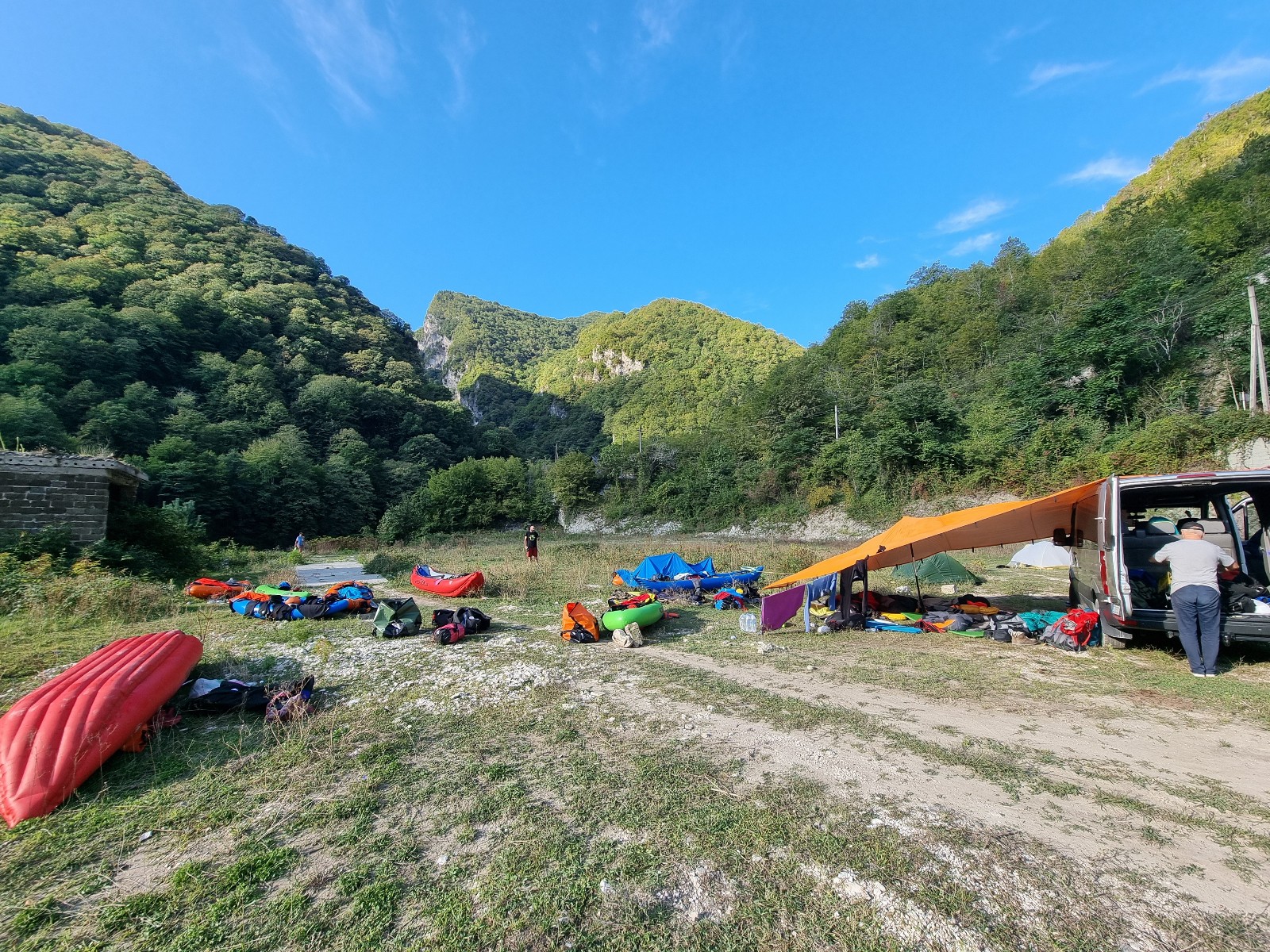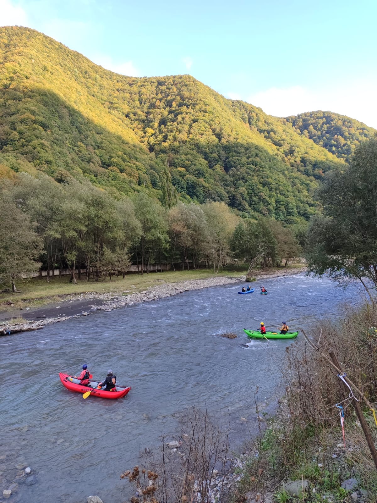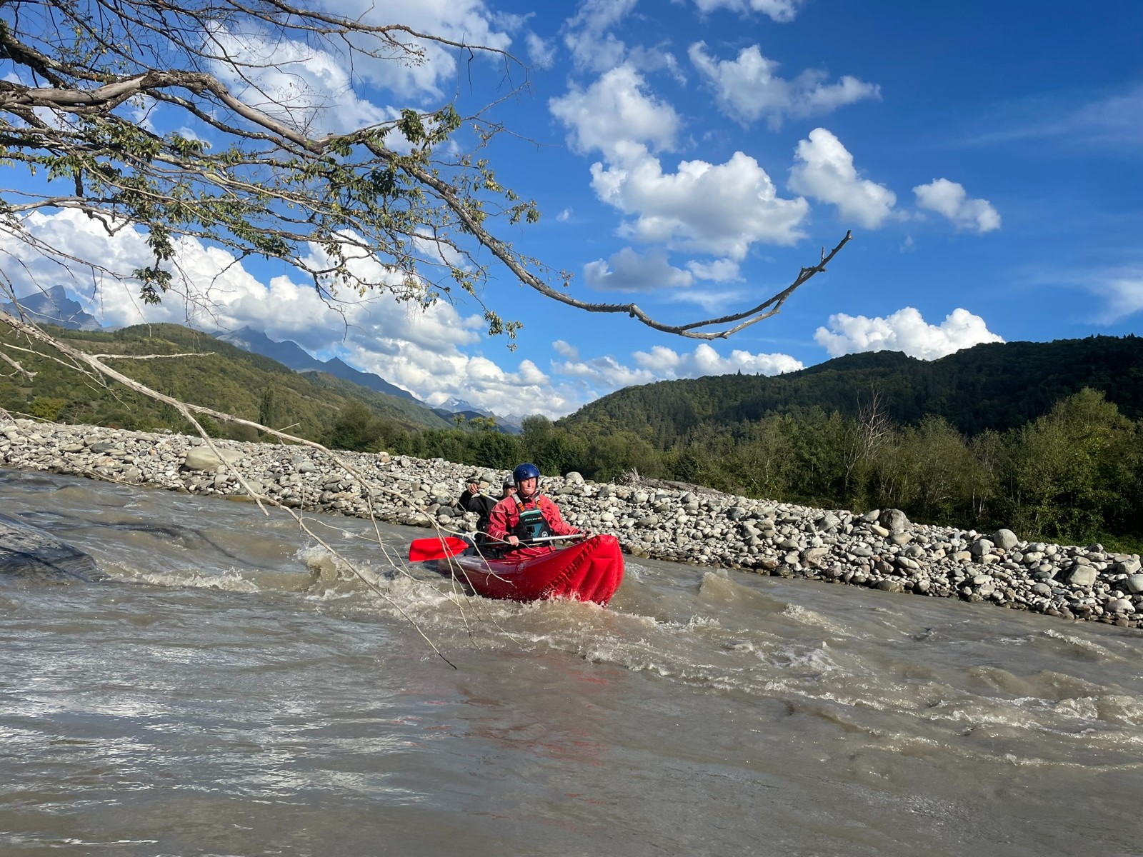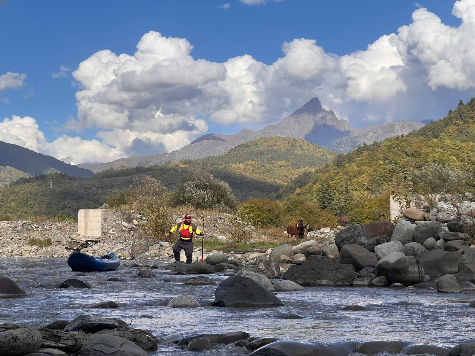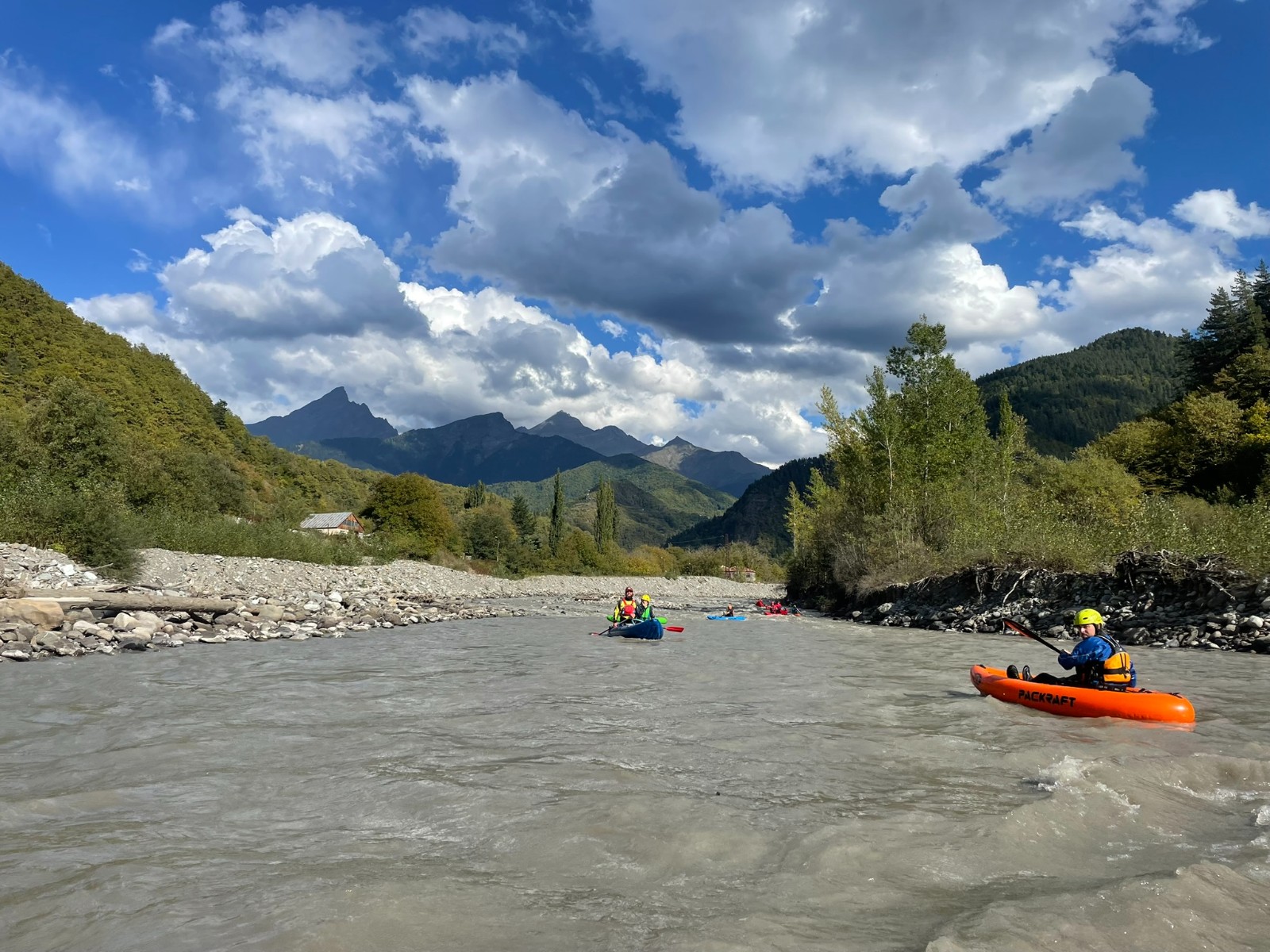 4. den: celodenní plavba po vlnách Tskhenistskhali. Řeka WW II – III svižně peláší lesním údolím a nabízí nádherné výhledy na okolní, bezmála třítisícové vrcholy i okolní pastviny při březích. Spoustu skvělých míst na piknikování a relax. V podvečer se nablížíme do kopců Lechakhumi a otevřou se nám první výhledy na pětitisícové štíty Kavkazu.