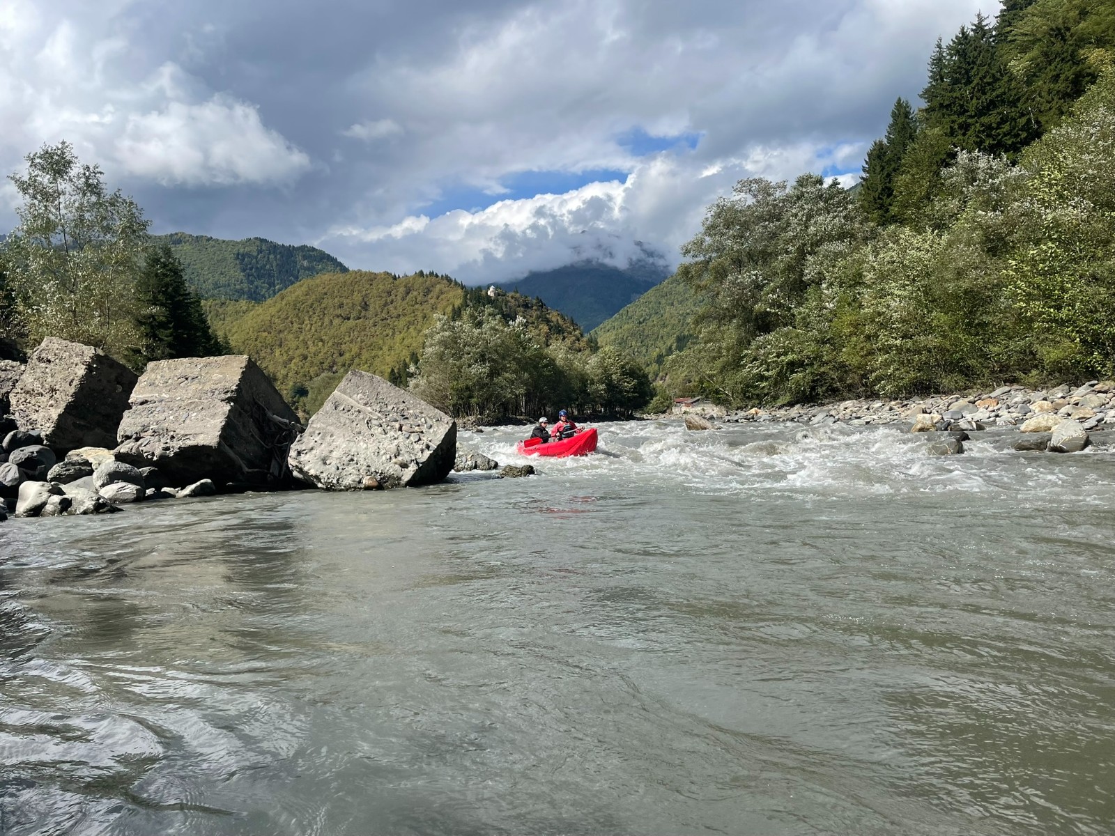 2. den: vyrážíme do hor na první gruzínskou řeku a rozpádlujeme se na panoramatickém úseku řeky Rioni, vklíněnou do mohutného údolí mezi horskými regiony Racha a Svanetie. Pohodové svezení v rychlém proudu s pěknými vlnami. Obtížnost řeky WW II. Po cestě na řeku krátká zastávka na katedrále Nikortsminda, mistrovském díle gruzínské církevní architektury, postavené před 1 000 lety.