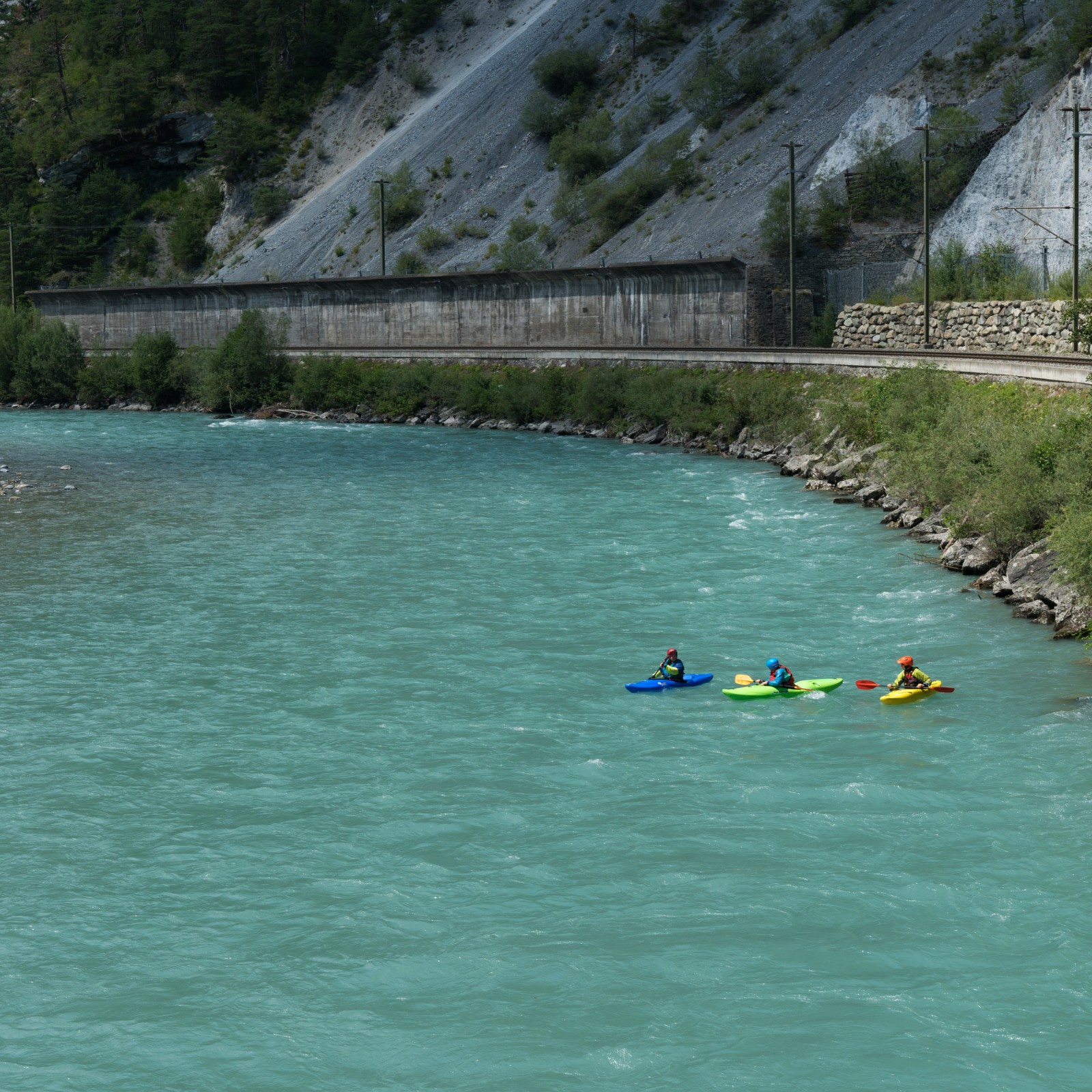 Vorderrhein: „Švýcarský Grand Canyon“ pádlování v hlubokém kaňonu na pěkné vodnaté řece se spoustou hravých a trénovacích míst. Patří mezi scénicky nejkrásnější řeky Švýcarska a bude jistotou našeho kajakářského týdne. Místní dráhy jsou kajakářům nakloněny, můžeme se nechat vyvézt místní vyhlídkovou lokálkou k další spanilé jízdě. Obtížnost WW II – III.