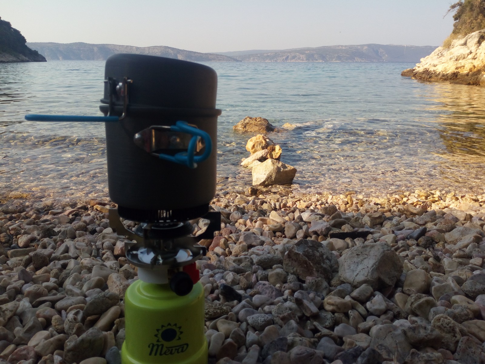 Na čem to uvařím? Vezmu si vařič, to je nápad. Ale nějakej malej, outdoorovej. A složím ho do ešusu. Hrneček a lžíce se hodí, nůž a sirky taky. A koupím si k tomu vařiči kartuš. Tu hodím jen tak do kajaku.