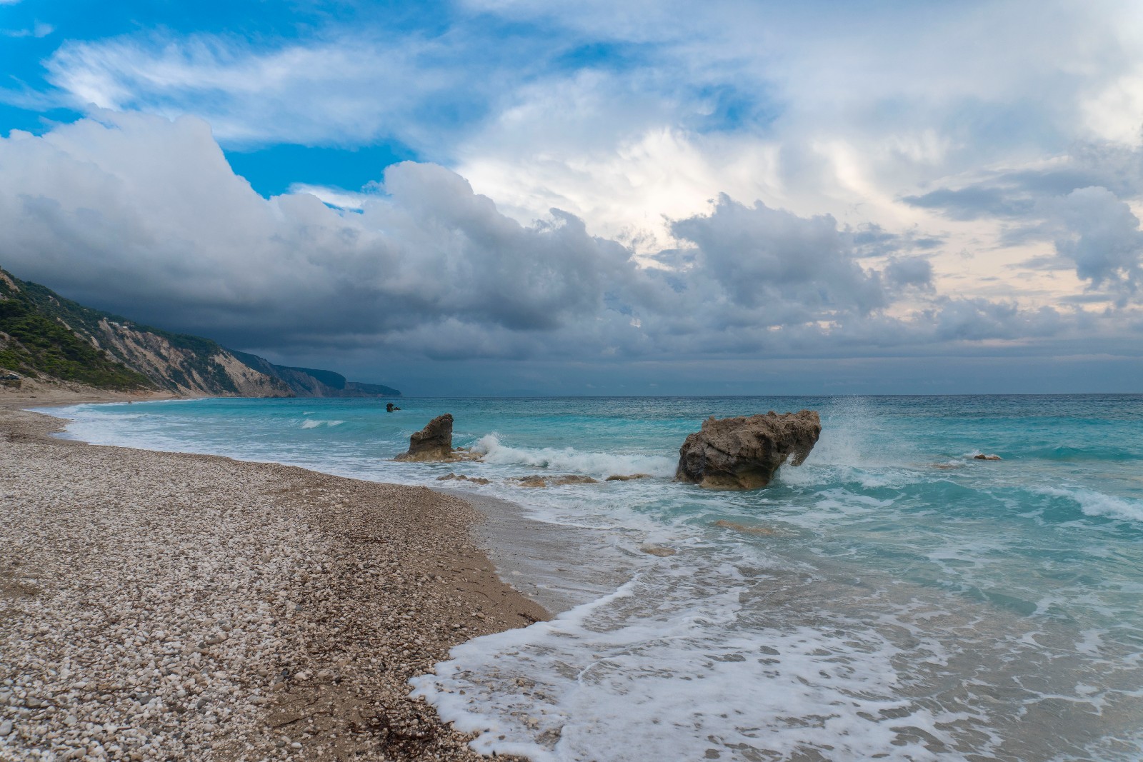 Mys přirozeně rozděluje Lefkadu na východní a západní pobřeží. Úzký pás nížin tvoří klidné pobřeží na východě.  Západní pobřeží se však strmě svažuje k moři a impozantní skály vytváří skrytá místa, tajuplné jeskyně a soustavu nádherných pláží s nejkrásnějším koupáním v Řecku. Pláž Porto Katsiki byla dokonce vyhlášena osmou nejkrásnější pláží světa a ani pláže EgremniAvali nebo Kalamitsi nezůstávají pozadu a řadí se vysoko na žebříčku nejkrásnějších pláží Středomoří.